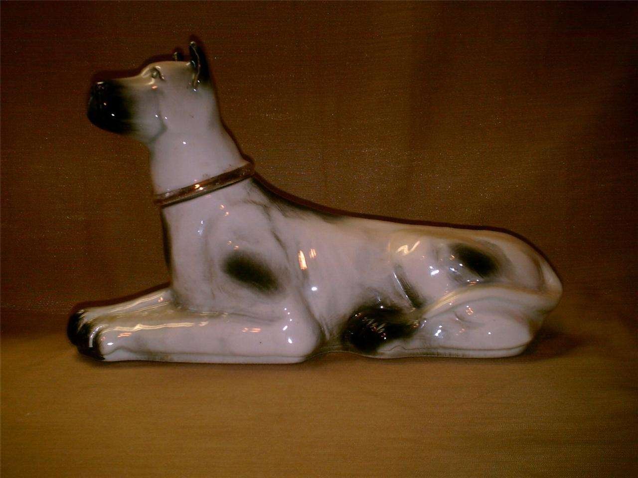 This handsome liquor decanter is in the shape of a reclining Great Dane with his head held high and alert. Original label is still on the decanter.
