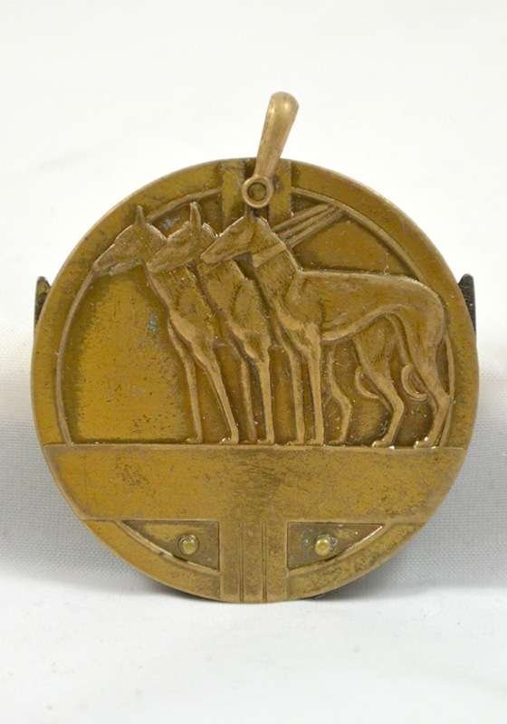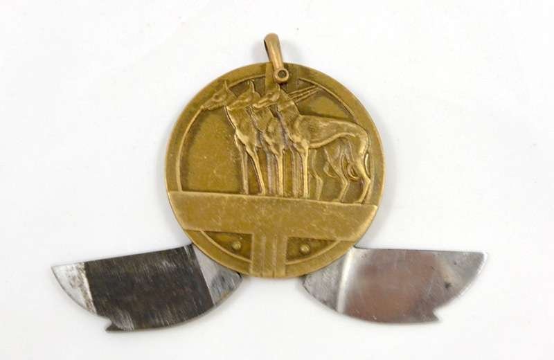 This elegant, Art Deco watch fob was once owned by a gentleman from the late 1930’s through 1980 who loved dog racing. It is truly a beautiful piece! It is 1 1/2″ in diameter, and shows exactly the same design with three standing Whippets or Greyhounds on each side. Opened, it reveals a cigar cutter on one side and a knife & file or perhaps a match striker on the other side. It is in good condition, considering its age and probable use, but it is not engraved. The top loop is in excellent condition and moves easily from side to side. The blades open and close easily as well.