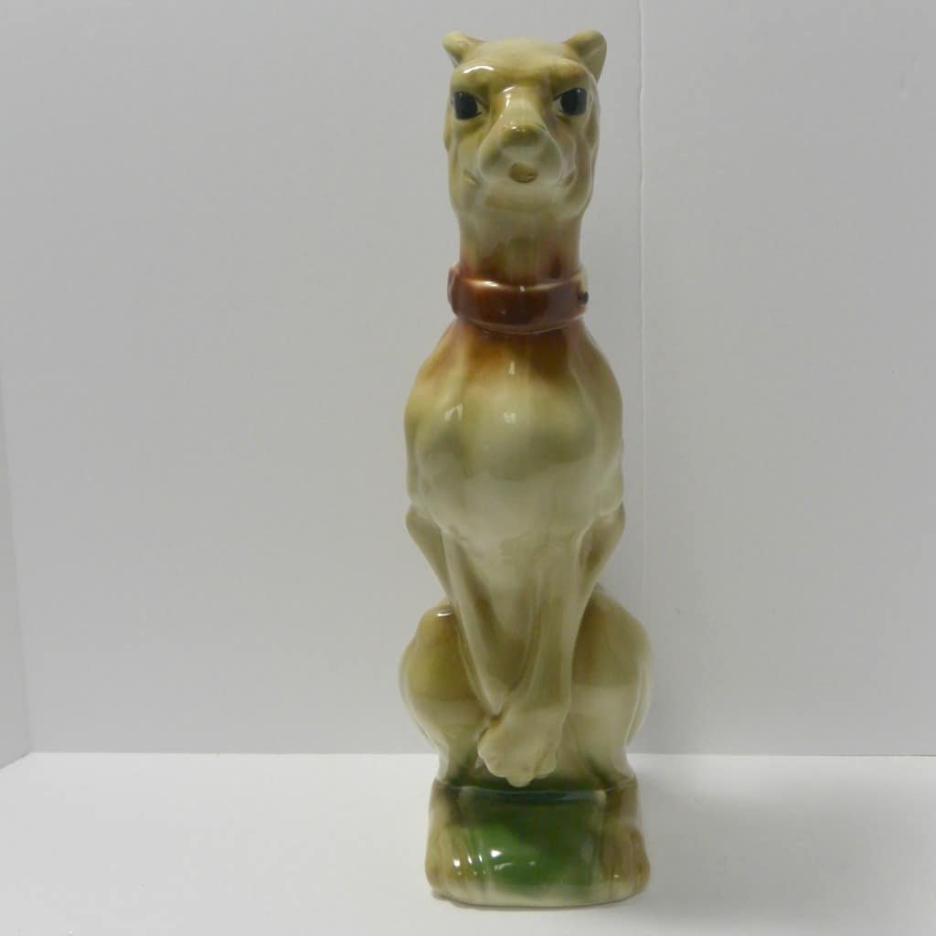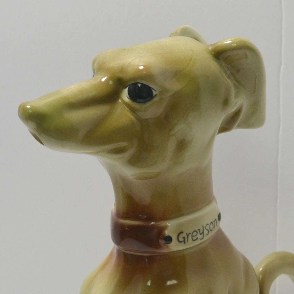 This gorgeous, Majolica pitcher is formed in the shape of a seated Greyhound dog. It is exquisitely done, capturing the poise and elegance that you would expect to see with this wonderful breed.