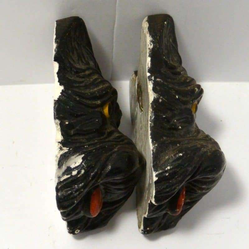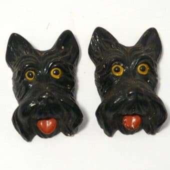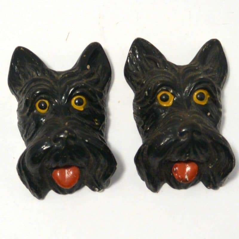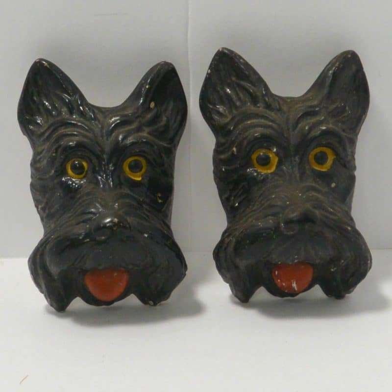 This matched pair of vintage Scottish Terrier dog chalkware plaques are just wonderful. Their animated expressions, with bright, two-tone eyes and fire engine red tongues almost make you think that they just might start barking.