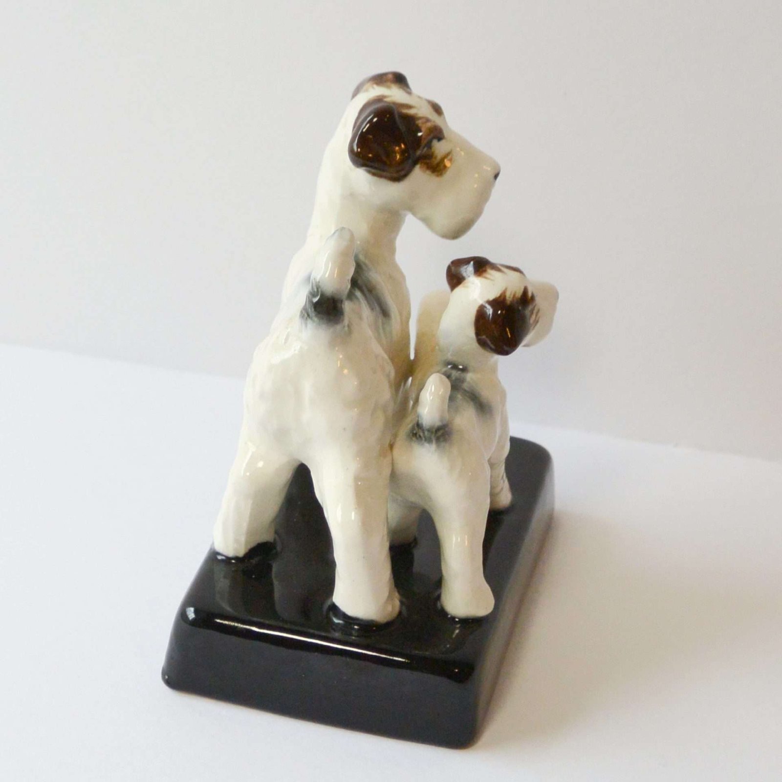 This vintage dog figurine is an adorable representation of an adult Wire-Haired Fox Terrier with a puppy.