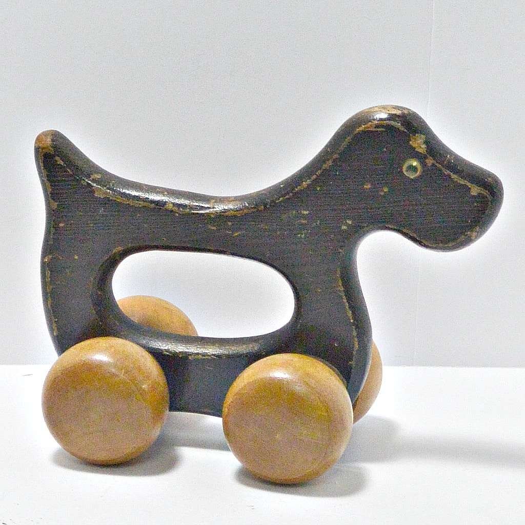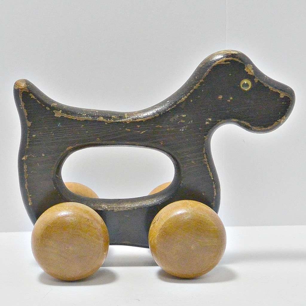 This vintage, wood, toy dog has been played with repeatedly and much loved. Designed in the shape of a puppy, it has been painted black, and still has its original paint, and the puppy has two glass eyes.