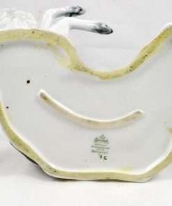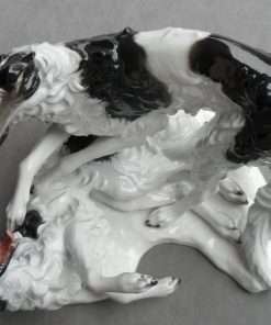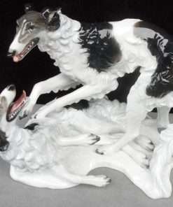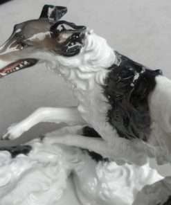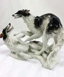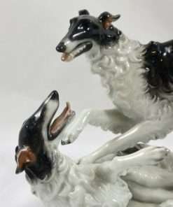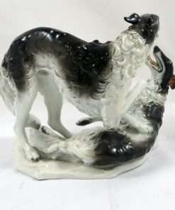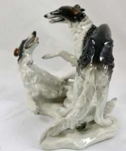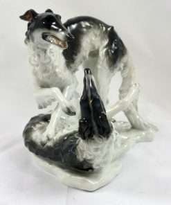 This stunning antique porcelain figural group was produced by Rosenthal and originally designed by F. Heidenreich in 1936. It is a tremendous tribute to this designer’s ability to capture the Borzois’ playful action and grace of movement. These two dogs are modeled in exquisite detail, from their expressive faces to their abundant swirls of fur. The name of the artist (F. Heidenreich) is impressed on the base, just below the standing dog’s back legs. It has the Rosenthal mark on the underside. It measures a full 5 1/4″ tall x 7 1/2″ long x 5 3/4″ wide and it is excellent condition. This piece will certainly add a touch of elegance to any room. It is the perfect choice for lovers of the breed, and a “must-have” in any Rosenthal collection.