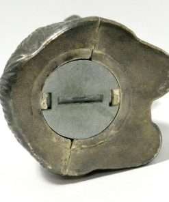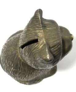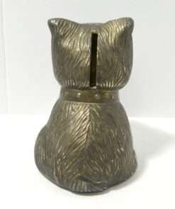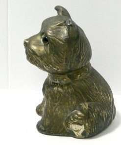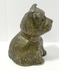 This adorable, vintage metal still bank looks like a Yorkie or other Terrier dog, sitting attentively and waiting to add a touch of whimsy to your home. This little beauty sits 4 1/2″ tall x 3 1/2″ long x 3 1/4″ wide. He has a lot of wonderful details with an abundance of fur lines, perky ears and big glass eyes. He is in great condition and so sweet, he is hard to pass by without smiling. This engaging pup is a fun gift for a Terrier enthusiast, and the perfect addition to any vintage bank collection.