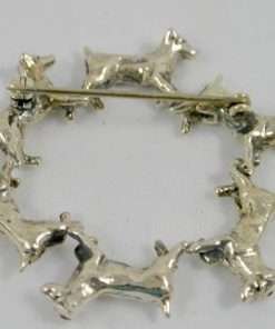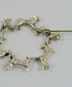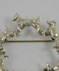 Six, lively Jack Russell Terriers are marching in a circle to create this wonderful, sterling silver pin. 1 3/4″ in diameter and in excellent condition, this pin is the perfect accessory for a lover of this wonderful, “high energy” breed.