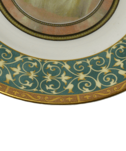 It has a narrow metallic gold band at its edge, followed by a wider deep green band with a scroll design. The Pekingese dog’s portrait is encircled by a band of soft rose.