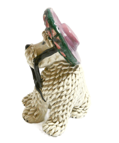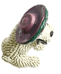 This vintage “spaghetti” Maltese dog looks amazing in her new bonnet!